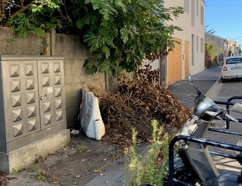 Des branchages de diverses tailles ainsi que des feuillages sont posés en travers du trottoir sur une largeur empêchant tout passage, à moins d’être champion de sauts (longueur et hauteur) ou vivre comme un casse-cou et se risquer sur la chaussée…